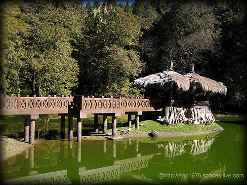 碧綠湖水的姐潭,茅草為頂的涼亭頗有味道