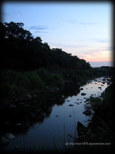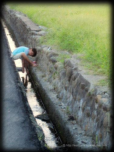 一處花田旁,面對晚霞,看見一個小男孩坐在清澈的水溝旁玩起水來,