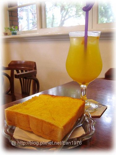 我最後點的早餐很簡單,也很經濟,就是一份奶油厚片土司(NT$30),另加一杯水味很重的不優還原柳橙汁。