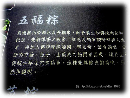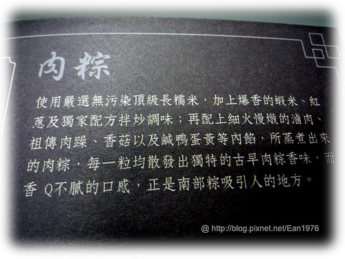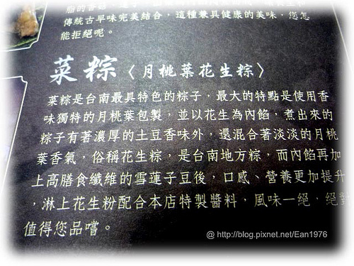 網頁上如這麼自我介紹的:"開業於民國72年,是台南第一家以連鎖加盟方式經營的粽子店,在台南頗負盛名。於92、93年榮獲國家品質保證金像獎及卓越商品企業金獎的肯定。"