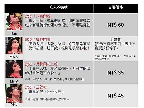 每個人吃完後的心裡價值,亦即願意掏出多少錢來買它(需注意的是這次每個人吃的是不同款粽喔)。