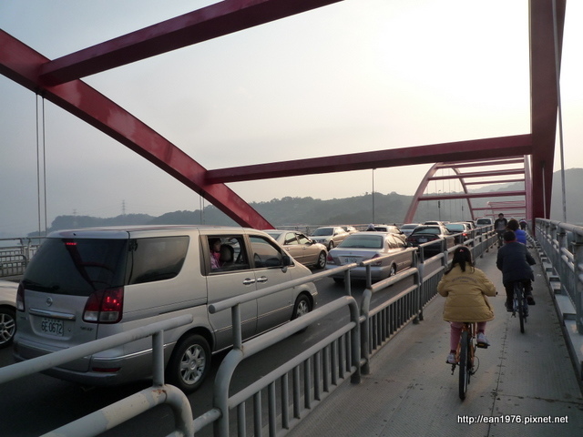 幾道紅色弧度組成的關渡大橋橫跨河面連接起淡水與八里,也是這次行程的必經之路,