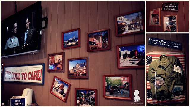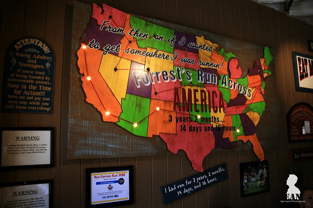 店裡頭除了有面懸掛牆上的螢幕重複播放著電影外,越戰軍服、劇照也在那供影迷回味。此外還有張美國地圖是電影中阿甘歷經3年2個月14天又16小時、傳教般橫跨美國的馬拉松路線圖,滿有意思的一段情節,無來由的開始與沒原因的結束,這樣無厘頭的作為或許是人最傾聽內心聲音的表現。當生活中遇到想放棄但找不到放棄的道理時,會想到阿甘突然停下腳步讓追隨者訝然的那一刻。