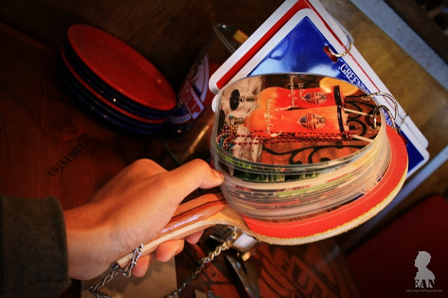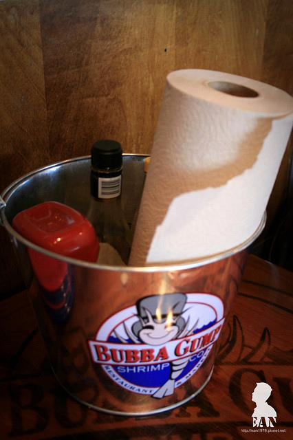 若餐廳單只是把電影中的道具釘在牆上陳列,那就遜了!坐定後我發現了有趣的東西,首先是飲料menu,用的是電影中讓阿甘出國比賽的乒乓球拍,上頭一張張疊著的是色彩鮮豔的各式飲料單;而一旁迷你版的金屬捕蝦桶裝的則是擦手紙還有幾罐醬料,真可愛。
