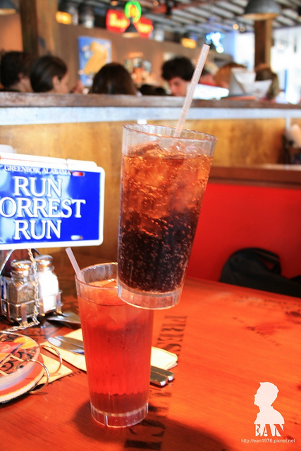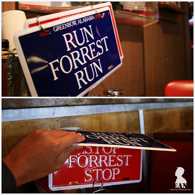 接下來發現桌邊掛著像車牌的東西更是令人莞爾!共有兩塊,藍色那塊所寫是電影中讓阿甘跑進美式足球隊的那句” Run Forrest Run”,這沒什麼稀罕,妙的是下面紅色那塊,上頭寫了相反的”Stop Forrest Stop”,這兩塊鐵板是用眼睛看的服務鈴,當你需要服務生只要翻到紅色那塊,不久就會有人停下詢問了。把電影裡的元素玩成實際用途,很具巧思與創意!