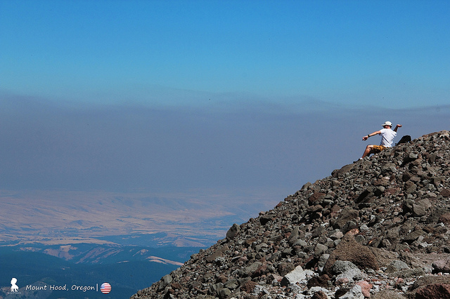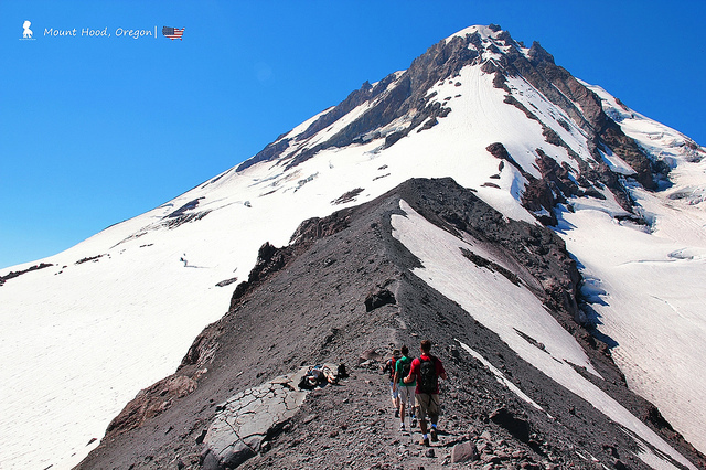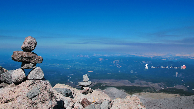 就是這個能看到厲害景色的步道,讓我來回8小時走了10.3公里、爬了海拔853公尺,紮實的一步又再一步的接近奧勒岡州海拔3,429公尺的最高峰Mount. Hood,好幾段都是踩在僅能容納一人行走的山脊上,一路伴隨的還有不化冰川,儘管陽光很曬,但一陣陣從下方拂過冰面的風吹來卻又涼爽宜人。自認膽子算大、大腦沒有安裝懼高警告機制的我,卻在該步道最後一段山脊上有些腳軟,當回頭俯瞰那一大片開闊又直達山下猶如大峽谷的景色,我的視覺神經連結了大腦中的恐懼中樞,腳步變得小心翼翼起來。
