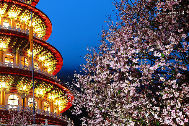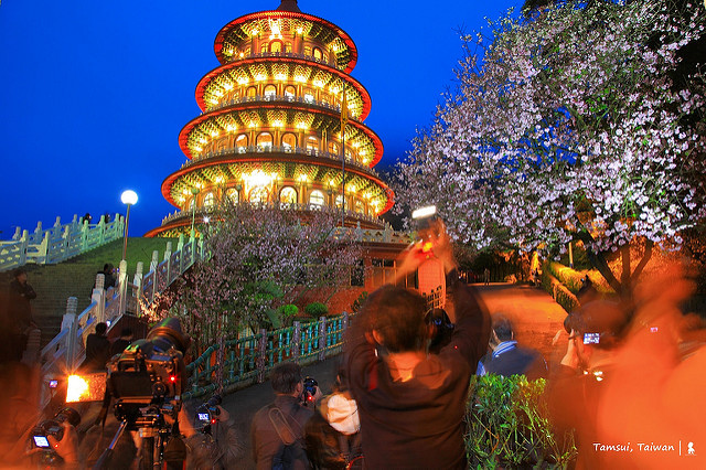 好在,今天一群攝影老手齊聚天元宮前廣場,幫我上了一堂夜間拍攝的外拍課程!只見黑夜裡的櫻花樹像被夜遊的孩子拿著手電筒東照西晃、冷不防的還會被強力閃光燈給倏地照亮。多謝現場專業攝手們的補光,才能讓只帶了腳架與相機的我跟著沾光,完成第一次的夜櫻拍攝,賺到也學習到!