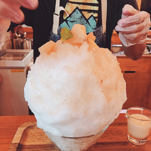 白桃刨冰會附一小杯煉乳在旁,但先別急著淋上,建議吃到一半等淋在上頭的水蜜桃糖漿吃的差不多了,這時再交由煉乳接手,讓這碗冰吃的是淋漓盡致。