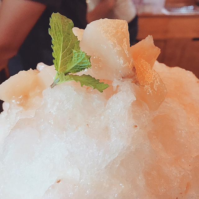這回我選了超季節限定的白桃口味,從新鮮水蜜桃到製成果漿,都是店家自己手作,因帶皮熬煮較香,卻也累了負責下步驟剝皮的苦手,據說非常費工,要吃得衝,提供到哪時老闆自己也難說個準!白桃刨冰我喜歡那股清甜芬芳,讓我想起京都南禪寺旁的青梅刨冰,若青梅刨冰是素顏的氣質美女,那眼前這碗白桃則略施了脂粉,各有風情。