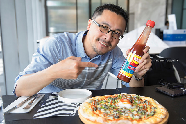 當服務人員端上披薩的同時,一併送上了東泉辣椒醬,我便大笑了!出身台中的人都知道,眼前這罐玻璃瓶身裝的可是故鄉味,不管是炒麵或筒仔米糕都能淋上一些,可說是台中人的老干媽,百搭!