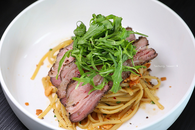還沒完,塞飽肚子的最後一道主菜是牛肉香蒜辣味細扁麵,最大特色是牛胸肉使用的是舒肥手法,以低溫烹調將肉汁鎖住,以不會太乾柴。