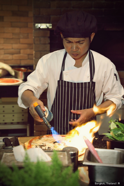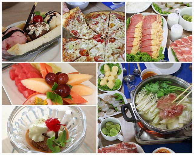游完泳換個衣服,晚餐我們在戶外享用,緊鄰著被照的亮晃晃的高爾夫球場。餐檯也是露天,還有座已經被燻得黑的披薩烤爐,雖是自助餐,但道地的泰式餐點很合我口味,忍不住又去多拿了一趟。我很喜歡這樣的用餐環境,帶點夜店風的節奏流動空氣中,讓氣氛變得好輕鬆,讓球場換上有別於白天的風貌。