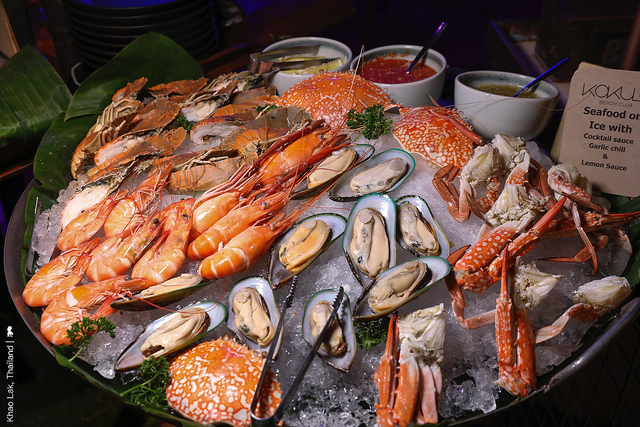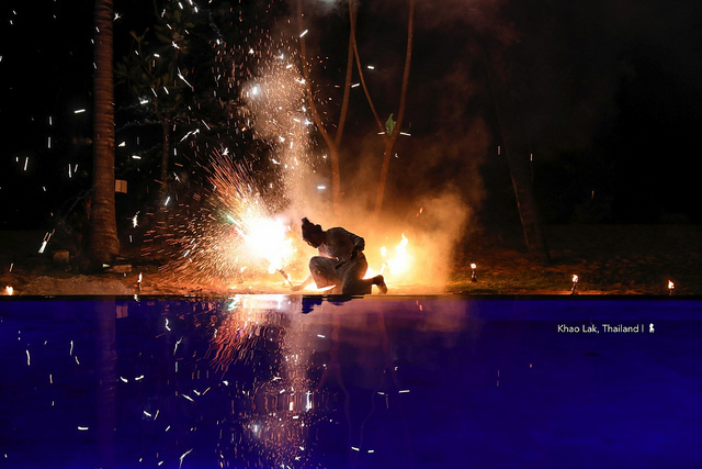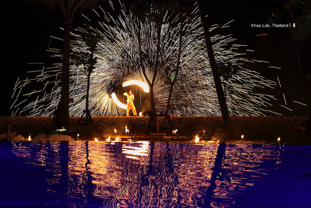 餐廳的自助晚餐也精彩,不管味覺或視覺。餐檯上的餐點都頗為精緻外,也有不少現點現做,因地利之便,大啖海鮮於此特別過癮。這晚,我們幸運遇上一場泳池邊的單人火花秀,像南太平洋島嶼上的火把秀,快速轉動成了風火輪,讓人驚嘆在後半加入手放煙火的設計,表演者像把寒夜篝火的劈啪火花或森林裡螢火蟲信手綻放,加上泳池的鏡射成映,成了歡娛繽紛的夢境,真叫人捨不得醒(查詢房價)。