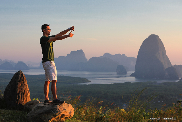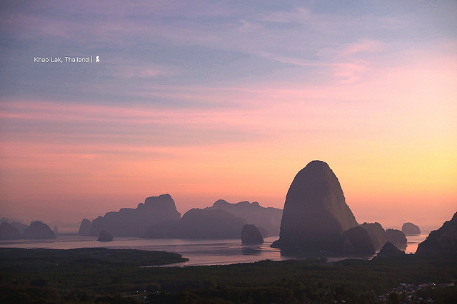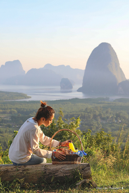 為了一場粉紅色日出,摸黑從度假村搭四輪驅動車前往,約兩小時車程,來到當地人的超私房景點,一個能俯瞰攀牙灣日出、名為 Ao Tho Li 的小山丘,一座座石灰岩洞穴拔地而起猶如洪荒之初,那是被譽為泰國最美的海上國家公園。從粉紅色朝霞、金黃色的海上日出,接著在仙境般的景色前野餐,手機、單眼再加空拍,想盡辦法捕捉眼前感動。